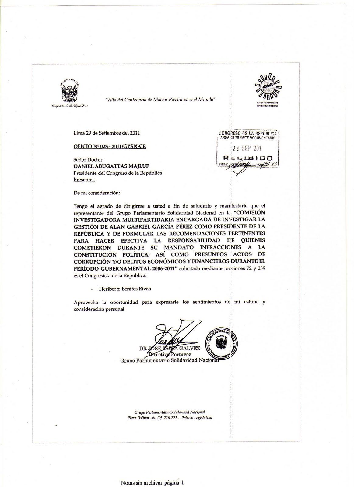 Dicha decision fue comunicada al presidente del Congreso de la Republica, Daniel Abugattas Majluf, mediante oficio Nº028-2011/GPSN-CE
